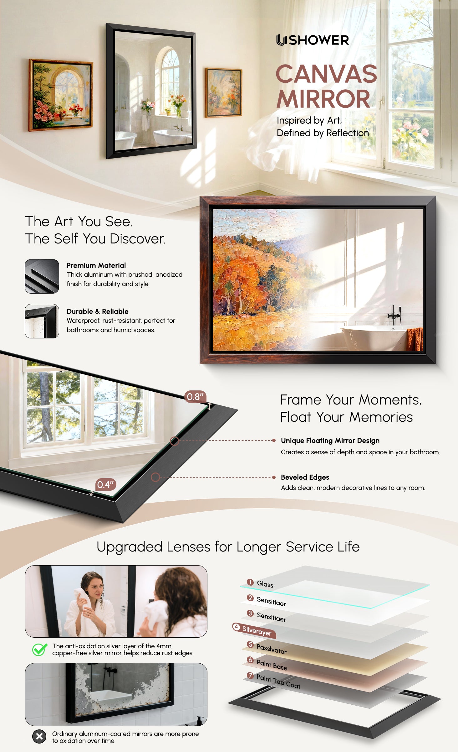 Inspired by classic art frames, this USHOWER bathroom mirror features a floating design with a 0.8" gap between the mirror and frame. The beveled edge adds depth, luxury, and a refined decorative touch to any room.
