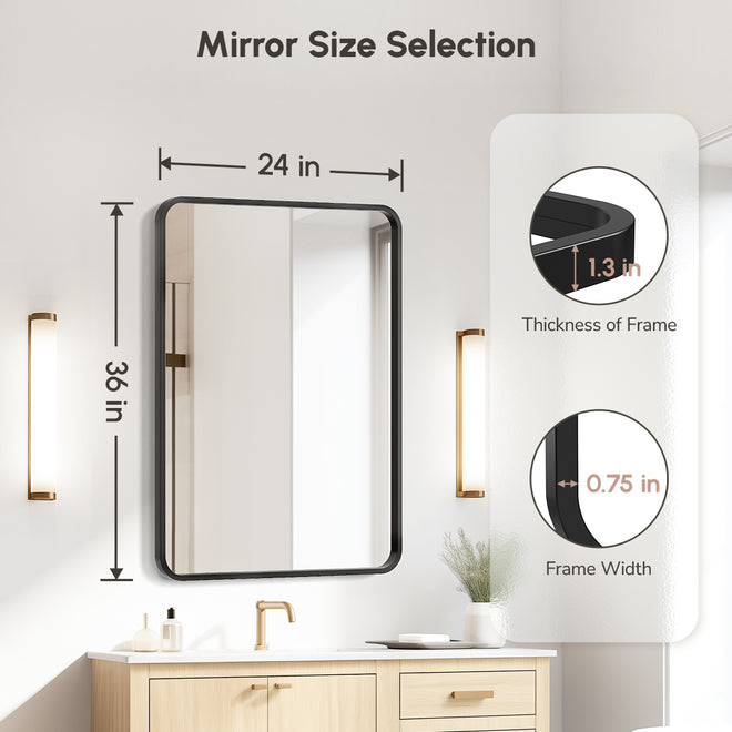 Measuring 24" x 36", this large black framed bathroom mirror is perfect for over-sink setups, bedroom dressers, or any wall that needs a modern touch.
