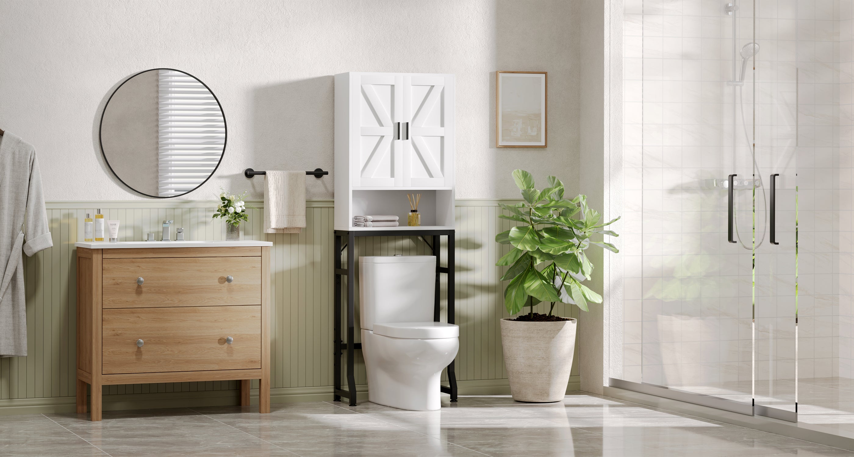 USHOWER Stokado Series – Over-the-Toilet Storage Cabinet with Wood Doors, White