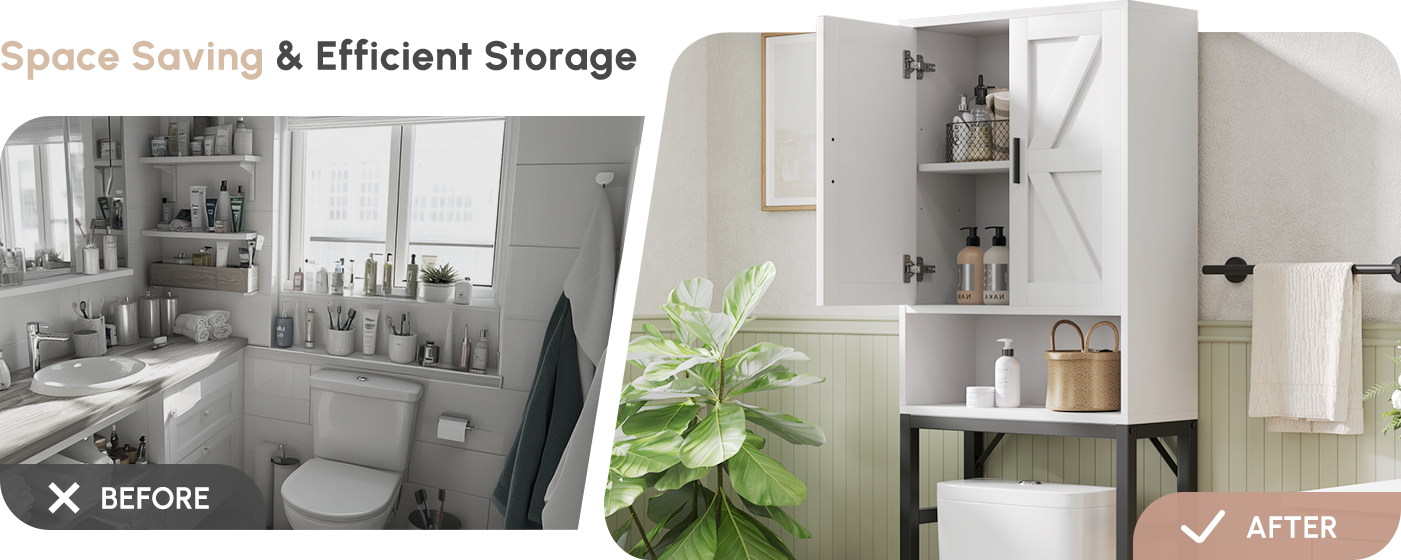 【Space-Saving Storage】Maximize vertical space above your toilet — open shelf keeps daily items at hand, while the upper cabinet neatly hides towels, cleaning supplies, and personal products.