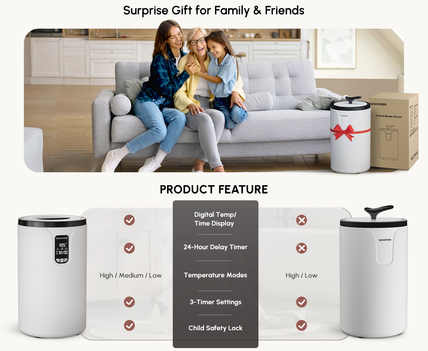 Weighing only 6.8 lbs, this portable towel warmer is easy to move between rooms and operates quietly and efficiently. Its elegant round design fits beautifully in any bathroom. A thoughtful gift for family or friends—perfect for Mother’s Day, birthdays, Christmas, Valentine’s Day, or Thanksgiving.