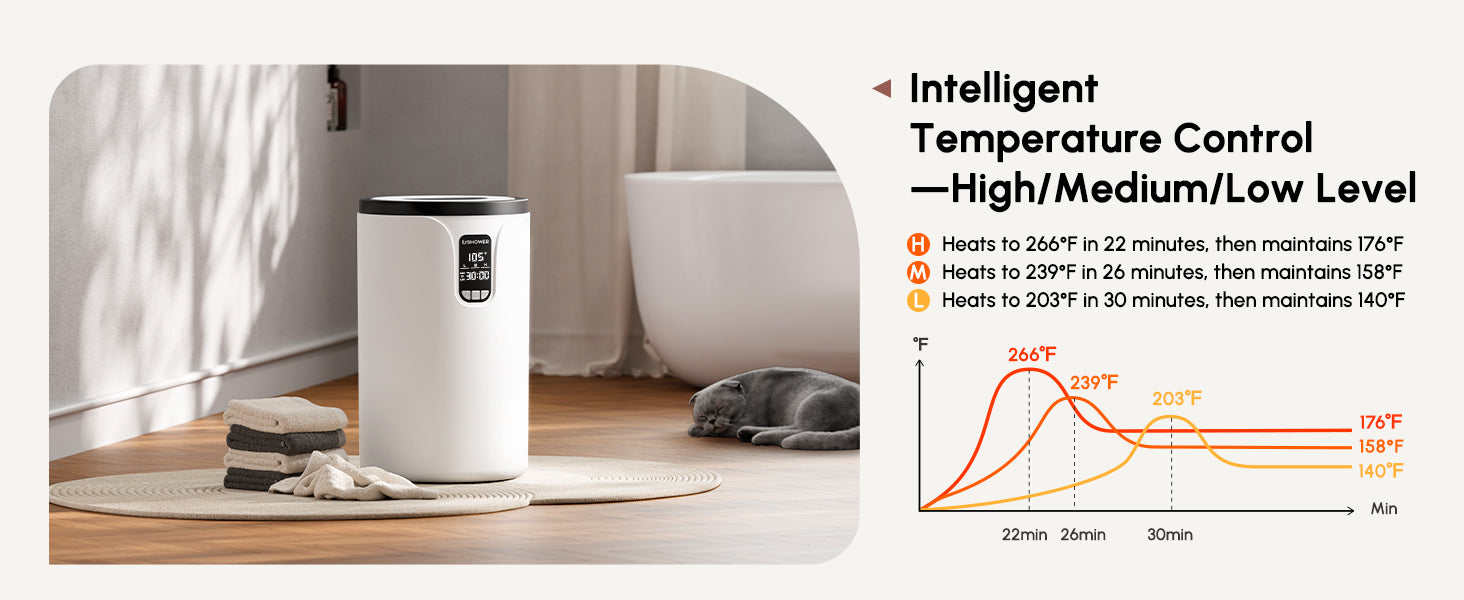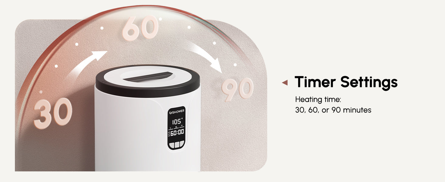 Enjoy fast and efficient heating every time you bathe. The towel warmer for bathroom heats up in just 1 minute and reaches high temperature within 6 minutes. Choose between three heat settings (Low, Medium, High) and three automatic timer options (30, 60, or 90 minutes) for a perfectly cozy towel whenever you need it—whether for a quick shower or a long soak.